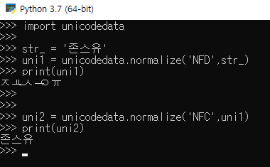 >>> # temp_str1 -> uni1 (NFD) : 자음 모음으로 분할