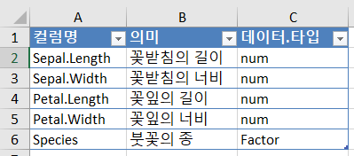 a_col_info = c('꽃받침의 길이','꽃받침의 너비','꽃잎의 길이','꽃잎의 너비','붓꽃의 종')