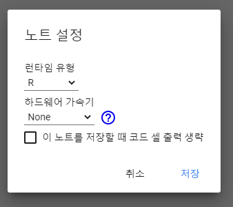 - 이 주소로 접속하고 노트 설정에 Runtime type을 R로 설정해줘야 함